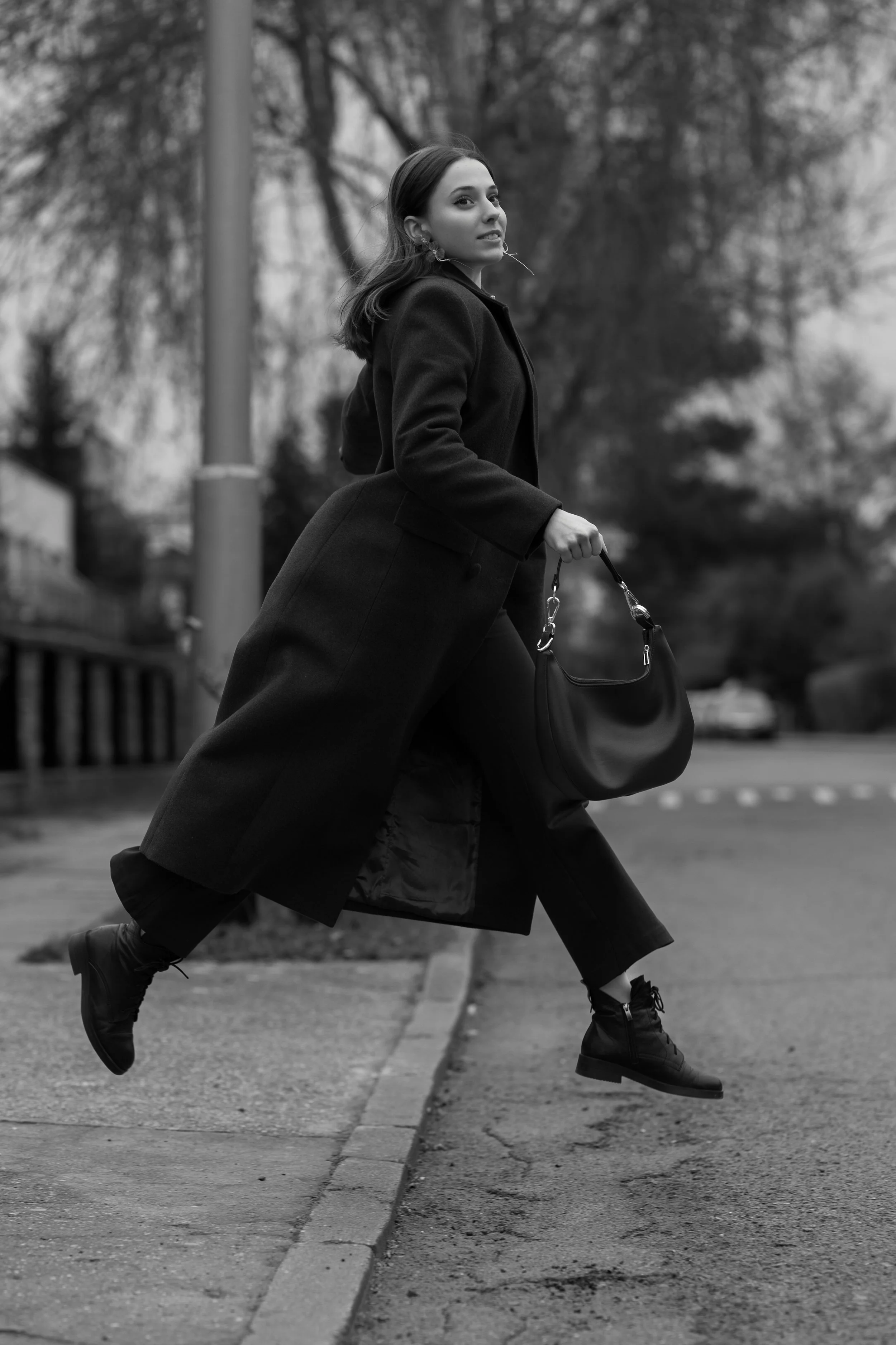 Black and white photo of a woman in a long coat walking across a curb, carrying a handbag, in an outdoor setting with trees and a blurred background.